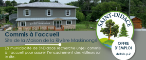 La municipalité de Saint-Didace est à la recherche d’un ou d’une personne polyvalente, dynamique et créative pour joindre son équipe à titre de commis à l’accueil sur le Site de la Maison de la Rivière Maskinongé. Relevant de la direction générale, de la coordonnatrice aux loisirs et de la directrice générale de l’organisme AGIR Maskinongé, la personne recherchée aura comme principal mandat d’assurer l’encadrement des visiteurs sur le site.
